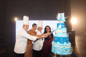 Para homenagear o aniversariante da noite (Cordon Bleu) uma verdadeira obra de pâtisserie: um bolo de quatro andares, com as cores branco e azul, fatiado a oito mãos por Alienor Cointreau, a diretora geral da instituição no Rio, Carla Rosas e os head-chefs Yann Kamps e Philippe Brye, celebrou como a fusão das culturas francesa e brasileira tornaram a escola um verdadeiro sucesso no Brasil.