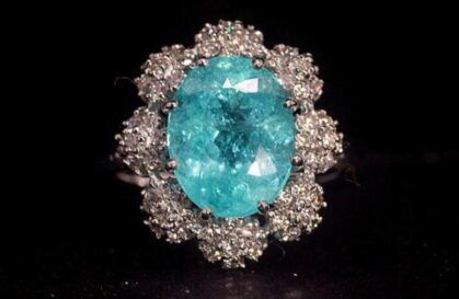 O grande destaque do evento é um anel de alto luxo em ouro branco 750, protagonizado por uma turmalina Paraíba rara, de aproximadamente 4,81 quilates, lapidação oval, cor intensa e brilho excepcional. A gema, considerada uma das mais valiosas do mundo por sua raridade e pelos tons vibrantes que a tornaram objeto de culto entre colecionadores, é realçada por um aro delicado de diamantes.