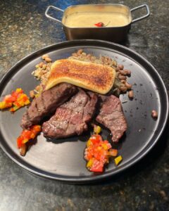 Para quem busca uma opção mais robusta, a tábua Carne de Sol na Brasa é uma das estrelas do cardápio. Preparada com miolo de alcatra curada no sal e assada na brasa, acompanha baião de dois, queijo coalho, aligot de macaxeira e vinagrete, reunindo sabores intensos e afetivos da culinária brasileira (R$ 94,00).